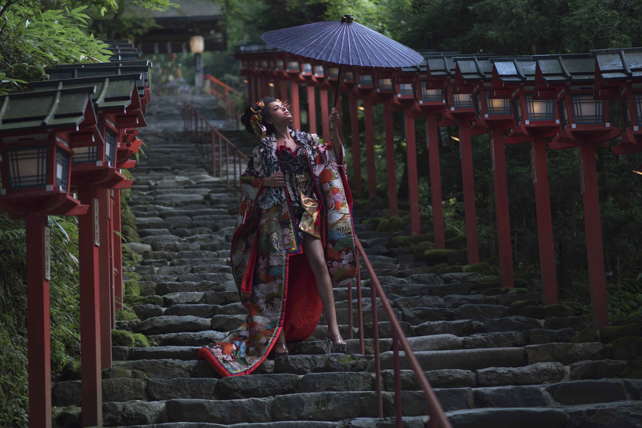 Durch das Hinzufügen von typisch japanischen Emotionen und Objekten wollte ich eine Kunst schaffen, die den japanischen Geist einbezieht und gleichzeitig verschiedene internationale Elemente integriert. Ich habe mich in Tempeln und Schreinen in Kyoto auf die Suche nach geeigneten Orten gemacht und Fotos an unterschiedlichen Orten aufgenommen. Bei einem der Tempel bat ich um einen großen Gefallen – am frühen Morgen die Laternen entlang der steinernen Treppe des Tempels zu erleuchten. Dann ließ ich ein Model mit hochhackigen Schuhen auf der Treppe stehen und machte Fotos von ihr. Sie stand absolut still mit einem Schirm in der Hand, und in diesem war ein Blitz installiert. Es war Sommer und extrem heiß, daher war die Fotosession ziemlich hart. Dennoch haben das M.Zuiko Digital ED 45mm F1.2 PRO und die OM-D E-M1 Mark II genau so funktioniert, wie ich es mir erhofft hatte.