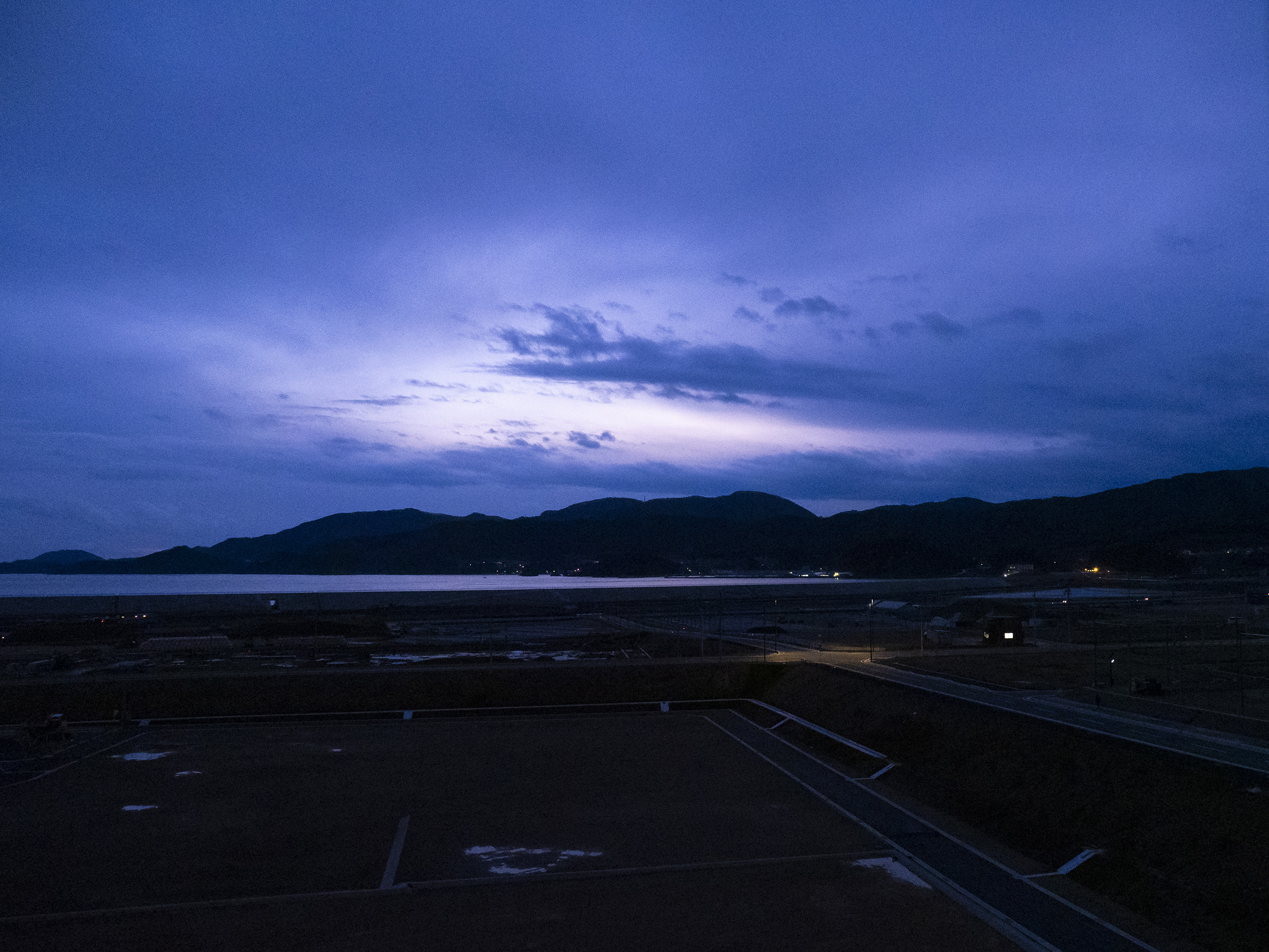 Eine Stadt im Morgengrauen. Einige gewerbliche Einrichtungen sind bereits fertiggestellt, aber der Weg bis zum vollständigen Wiederaufbau ist noch weit. (Rikuzentakata-Stadt, Präfektur Iwate, Januar 2020)