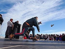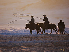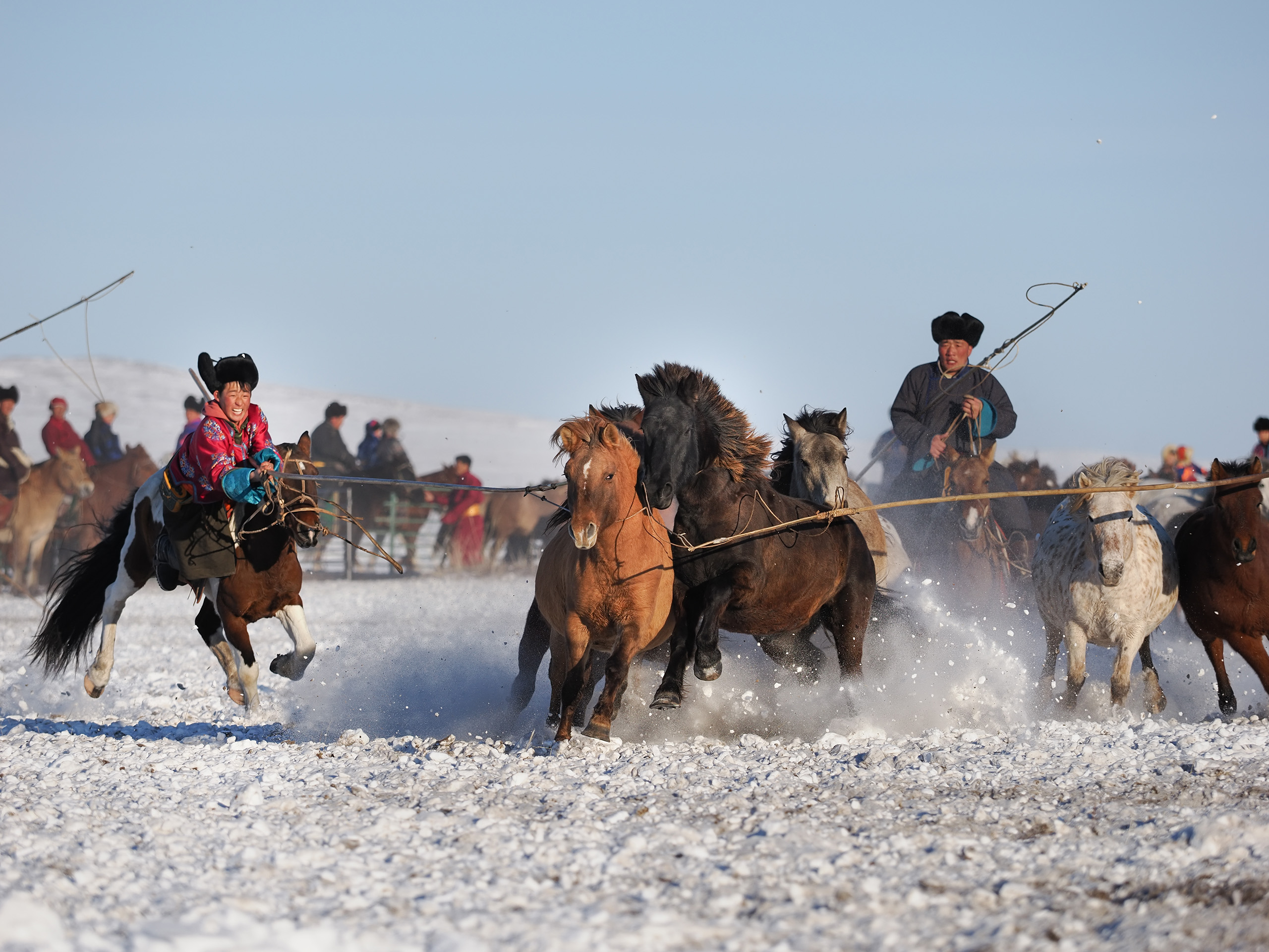 Im November findet in der Provinz Khentii im Osten der Mongolei ein Pferdefest statt. Obwohl es um Pferde geht, sind die Nomaden die wahren Stars der Show. Denn bei diesem Wettbewerb können sie ihre hervorragenden Fähigkeiten im Umgang mit Pferden unter Beweis stellen. Zu den Veranstaltungen gehören das Zusammentreiben von halbwilden Pferden in der Prärie mit einer Uurga (Lassostange) und das Reiten von wilden Pferden ohne Sattel in einem Rodeo, um sie anschließend zu zähmen. Wenn ein Pferd gegen einen Menschen in wiederholten Kraftakten antritt, sind die Spielregeln wirklich einfach. Wenn es dem Pferd gelingt zu entkommen, hat es gewonnen. Wenn die Nomaden ihr Pferd verlieren oder vom Pferd fallen, lacht die Menge. Allerdings verlieren die stolzen Nomadenmänner nicht so leicht. Ich möchte keinen einzigen Moment verpassen, deshalb schaue ich immer wieder durch den Sucher der OM-1 Mark II und mache ruhige Serienaufnahmen. Sie funktioniert auch bei Kälte problemlos, der Autofokus verfolgt bewegte Motive ohne Probleme und auch über den Akku kann ich mich nicht beklagen.