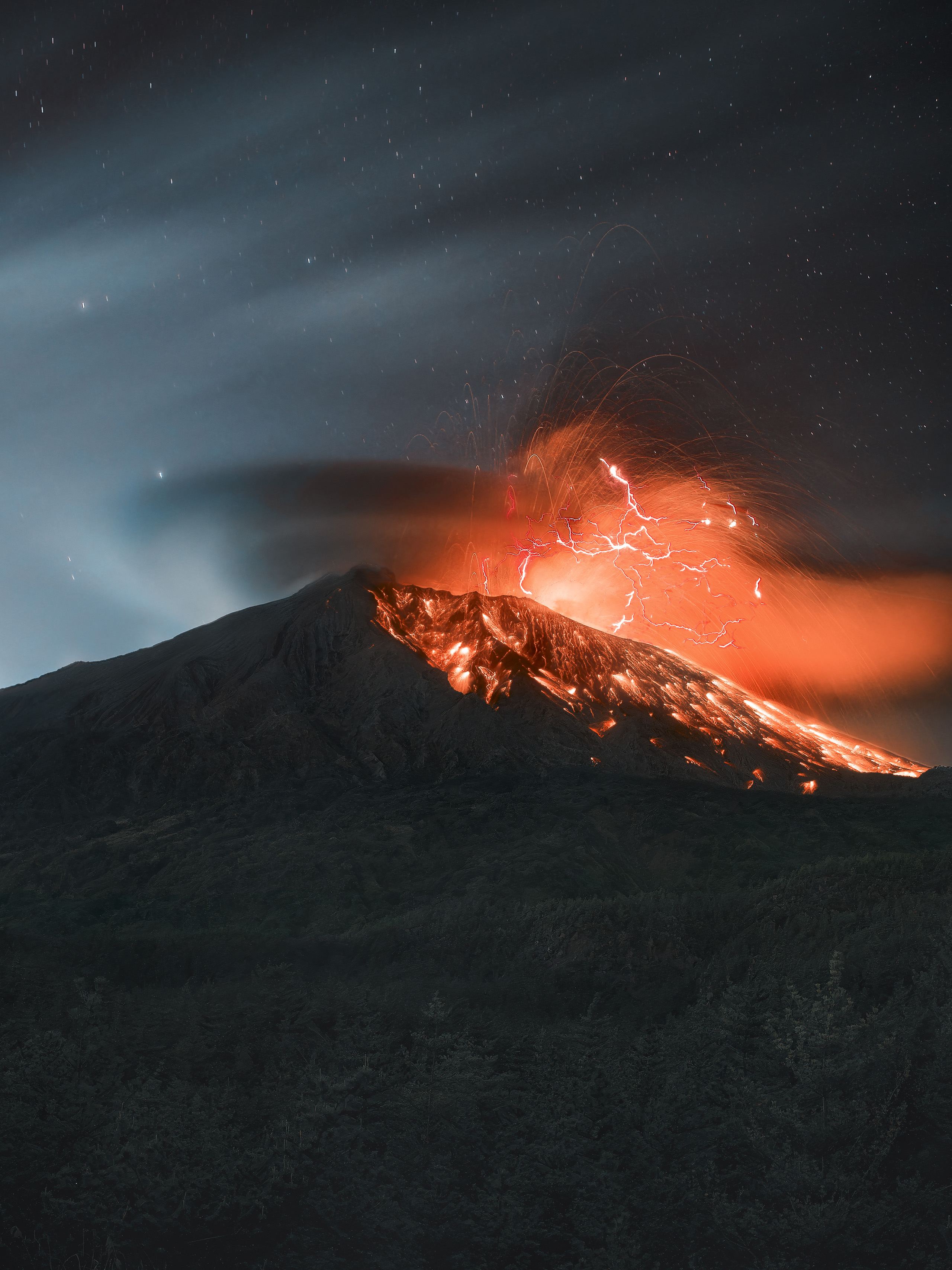 Eine gefährlich aussehende, explosive Eruption beginnt plötzlich, und ein Phönix zeigt sich zusammen mit vulkanischem Donnern.