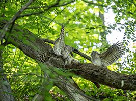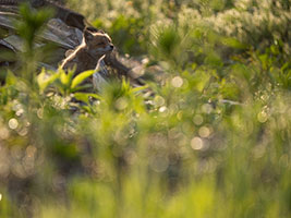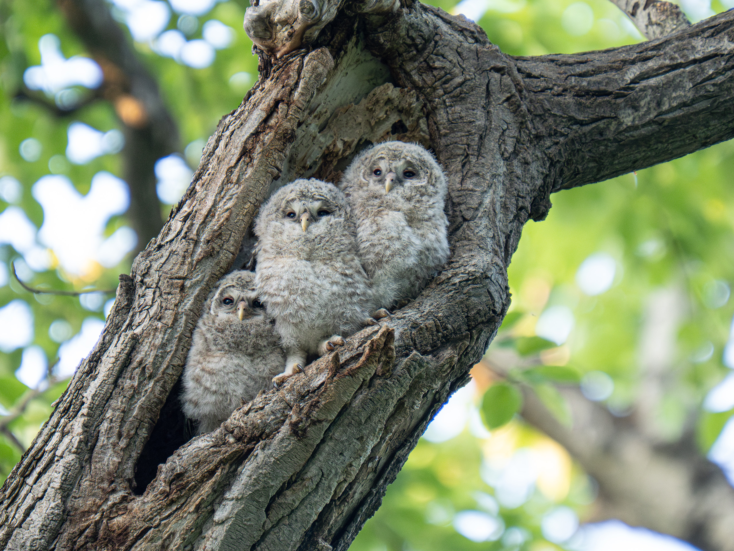 巣立ちしたばかりのエゾフクロウの雛がカラスに襲撃され地面に落ちてしまった。まだ警戒心が無く純粋な眼差しだ。その姿は、森の妖精そのものだ。夕暮れ時であたりは暗くなっていたが強力な手ぶれ補正+明るいレンズのおかげでISO感度を上げすぎてノイズが出るのを抑えることができる。数枚撮影し親が警戒しない距離まで離れると、親に呼ばれ近くの木の上に自ら登っていった。周囲の状況を細かく把握し、野鳥たちに寄り添った撮影を心掛けている。